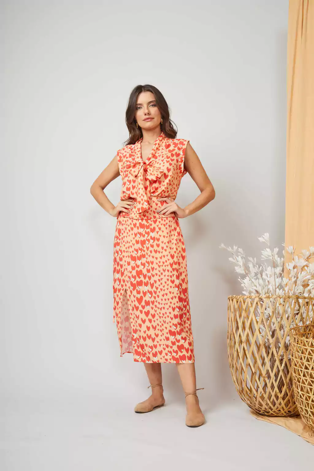 A estampa de corações confere à blusa um toque romântico de forma moderna. Este detalhe encantador destaca a feminilidade de maneira sutil, tornando a blusa perfeita para ocasiões especiais ou para elevar o visual diário. A manga japonesa adiciona um elemento de elegância diferenciado à blusa. Este estilo de manga proporciona um visual fluido e gráfico, destacando os ombros de maneira sofisticada. O laço na blusa não apenas adiciona um toque romântico, mas também oferece versatilidade. Permite um ajuste personalizado ao redor do pescoço, proporcionando a oportunidade de estilizar a peça de acordo com sua preferência. A manga japonesa não só confere elegância, mas também proporciona um toque de frescor e leveza ao design. Ideal para climas mais quentes, essa característica torna a blusa adequada para diferentes estações. O laço, quando bem aplicado, traz um toque fashion à blusa. Esta peça não é apenas funcional, mas também acrescenta um elemento estiloso que destaca a atenção aos detalhes e a busca por uma moda atual. A combinação de manga japonesa, estampa de corações e laço cria uma blusa única.