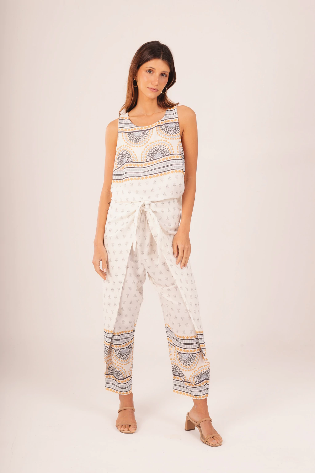 Calça estilo cenoura com amarração na cintura, cós de elástico estampa exclusiva