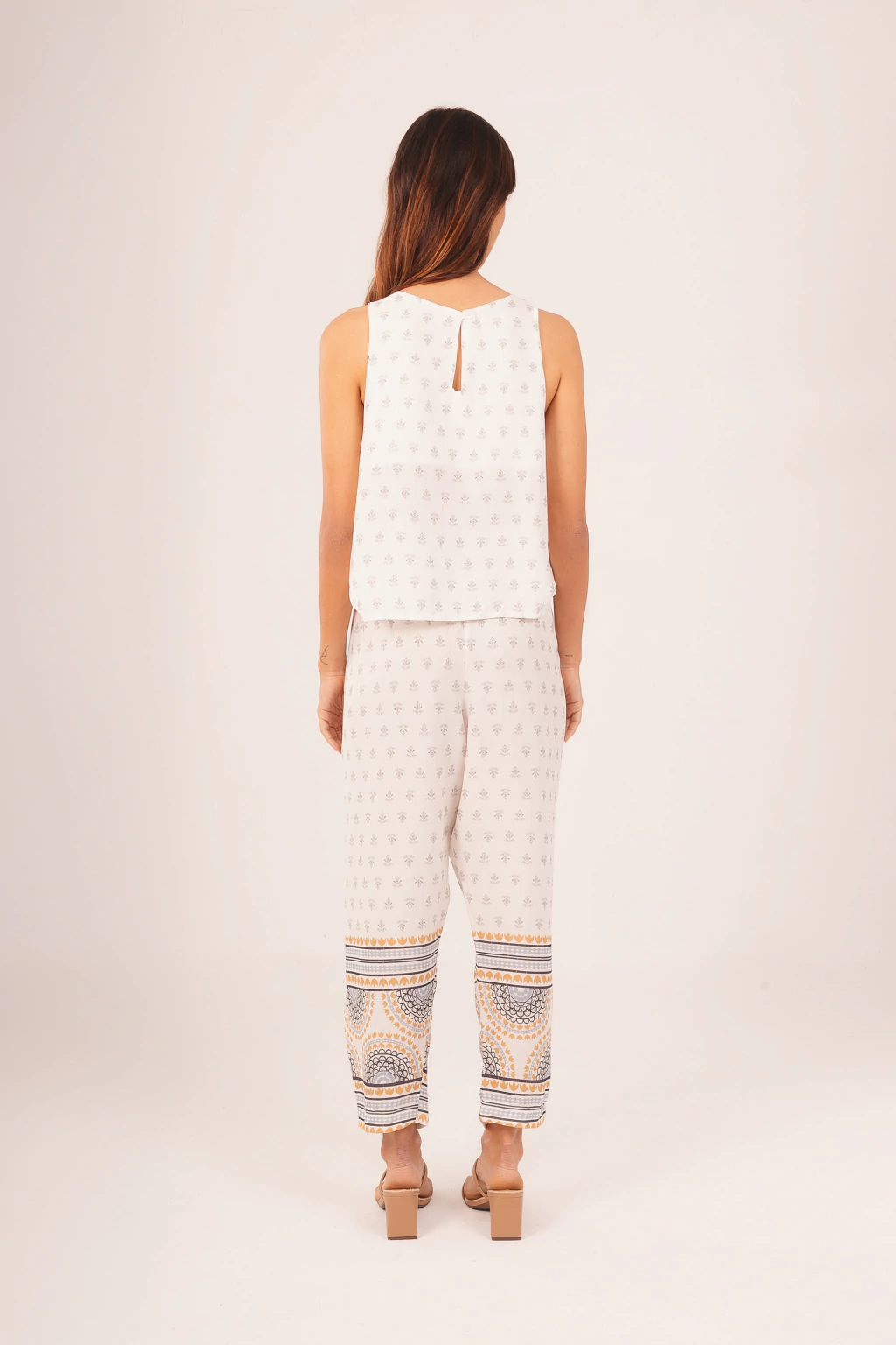 A calça cenoura é conhecida por sua silhueta sofisticada, que valoriza a cintura e cria um caimento impecável para mulheres que gostam de estilo com leveza. O detalhe da faixa ajustável deixa a peça ainda mais charmosa, trazendo equilíbrio entre conforto e sofisticação em qualquer produção. Desenvolvida especialmente para esta coleção, a estampa transforma a calça em um destaque de estilo único, perfeita para mulheres que gostam de peças originais. Combine com camisas de alfaiataria para o trabalho, t-shirts básicas para o dia a dia ou um top minimalista para produções casuais chic. Uma calça que vai do escritório ao happy hour com facilidade. Mesmo com toque moderno, a modelagem cenoura já é um clássico da moda, garantindo que a peça seja um investimento inteligente e duradouro no seu closet.