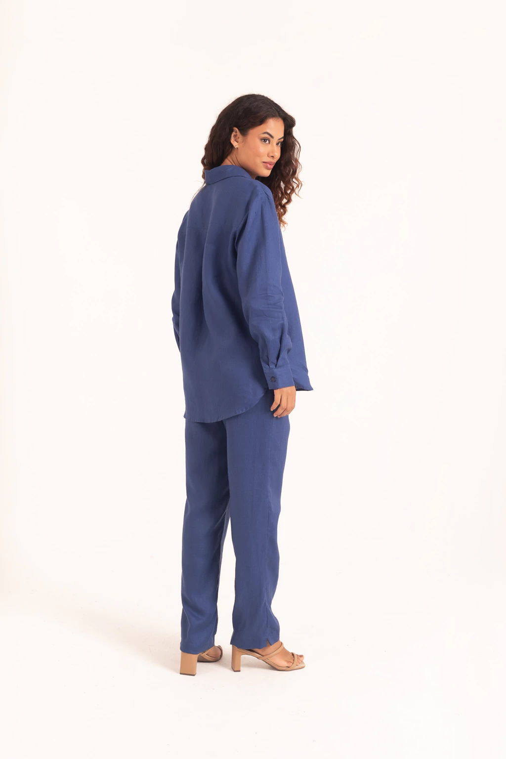 Calça reta com elástico e bolso faca em linho azul - Calça Casablanca Linho Azul