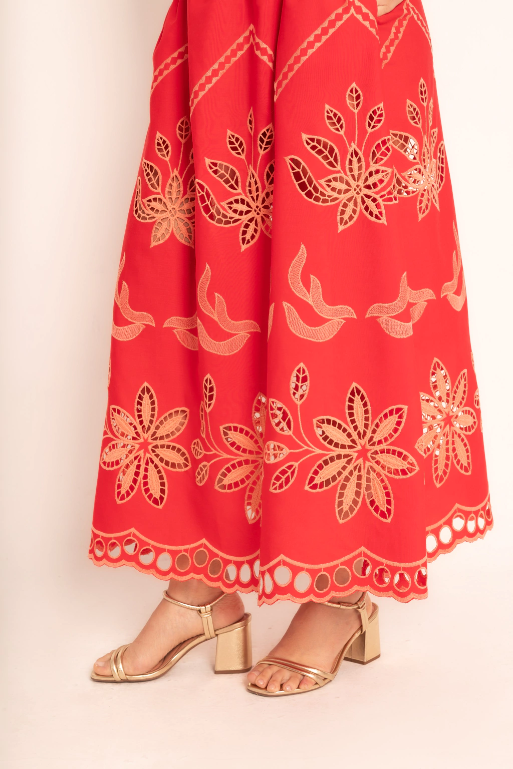 Vestido Midi bordado Richelieu, decote nadador, abotoamento nas costas ,elástico na cintura
